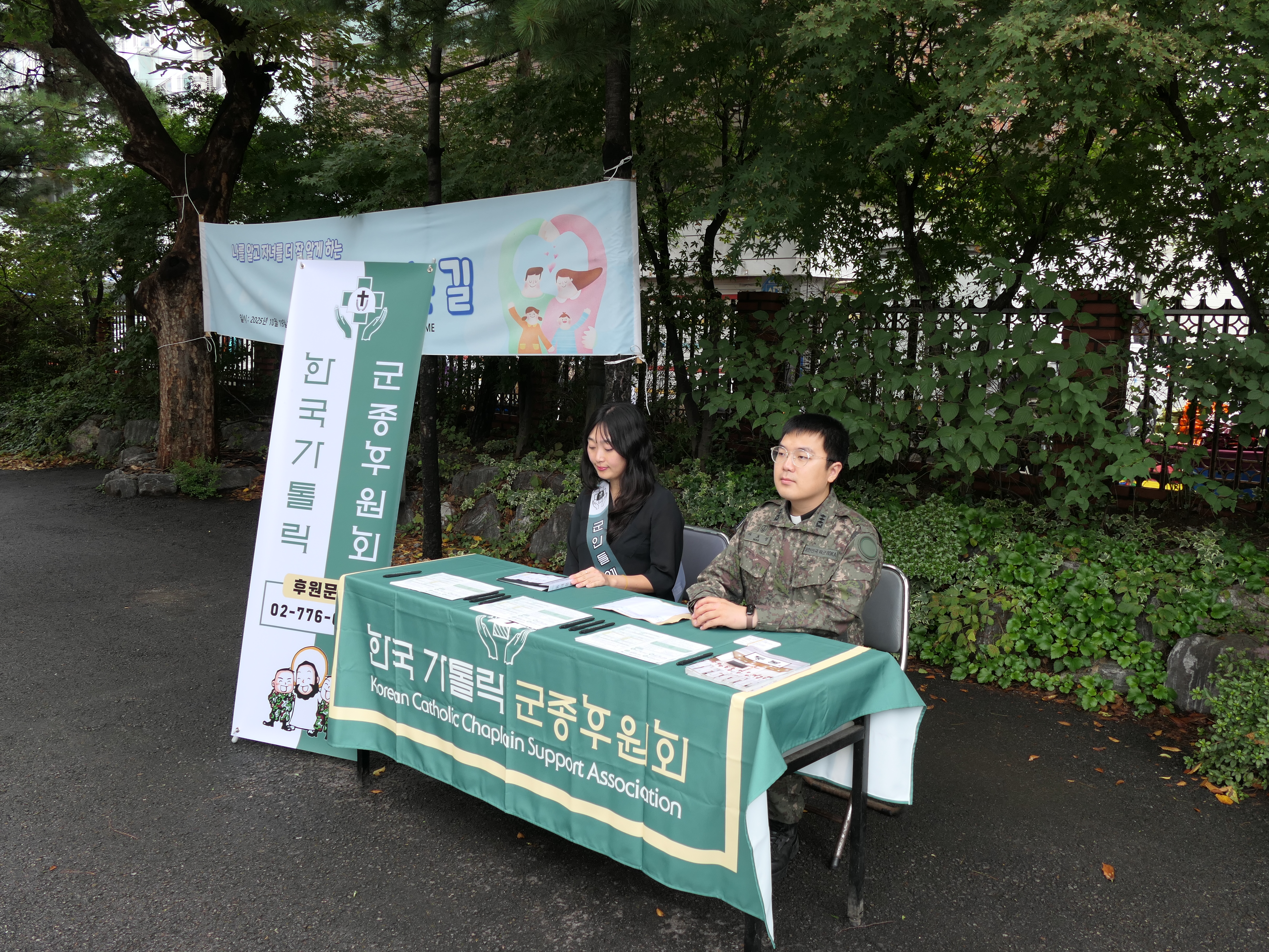 군인 주일을 맞아 중부 전선 최전방에 있는 육군 제15사단(승리부대)에서 사목 중이신 마호성(아브라함, 육군 대위) 신부님께서 관계자와 함께 본당을 방문했습니다. 마호성 신부님은 11일(토) 저녁 특전미사와 12일(주일) 교중미사를 포함한 새벽, 학생, 청년미사에서 '한국 가톨릭 군종후원회'를 소개하고, 장병들의 쾌적한 환경과 원활한 신앙생활을 위한 우리 본당 신자들의 물질적인 후원을 부탁했습니다. 미사 모습은 교중 미사이며, 본당 마당의 풍경은 9시(학생) 미사와 교중 미사 뒤의 모습입니다.