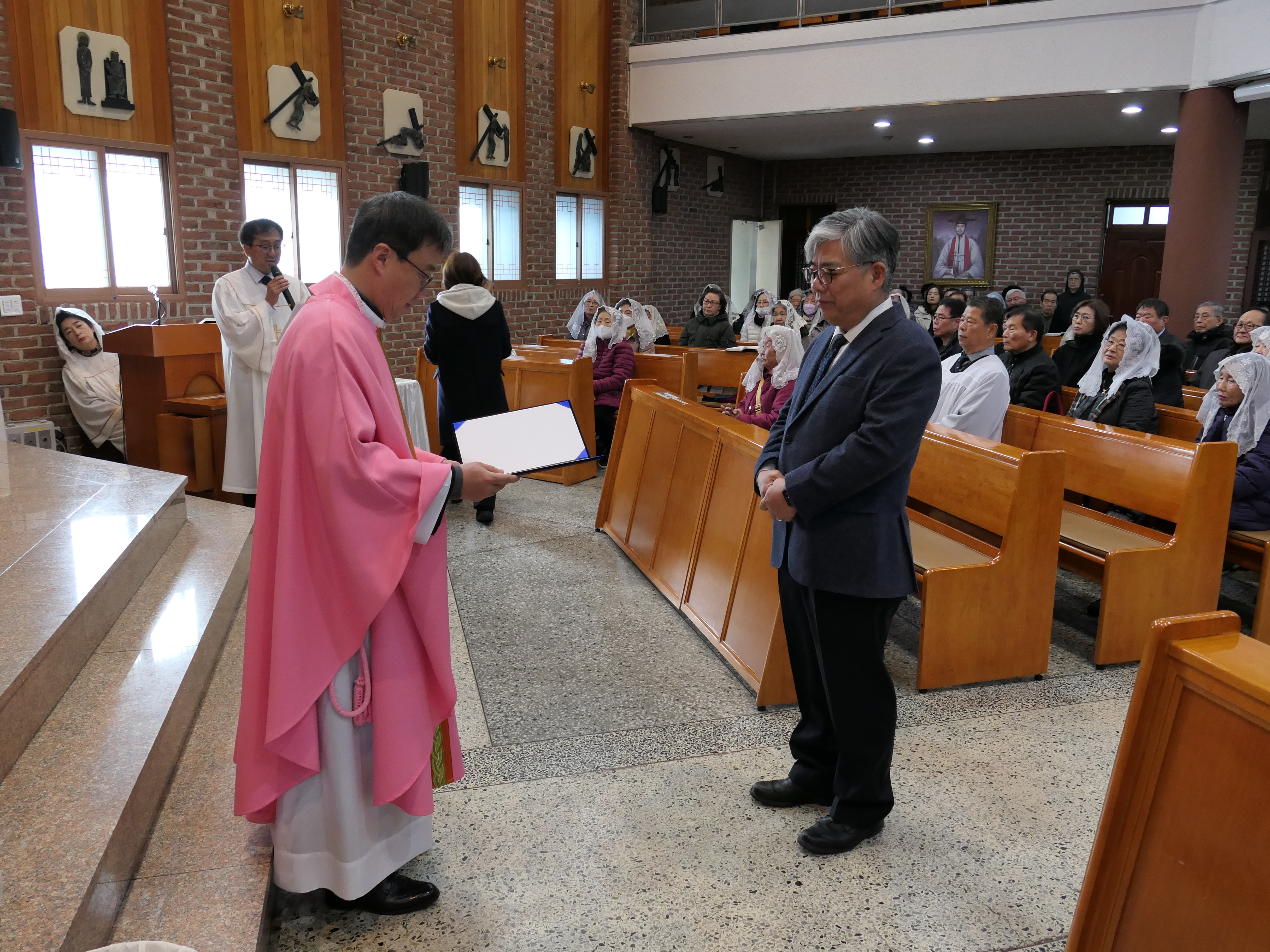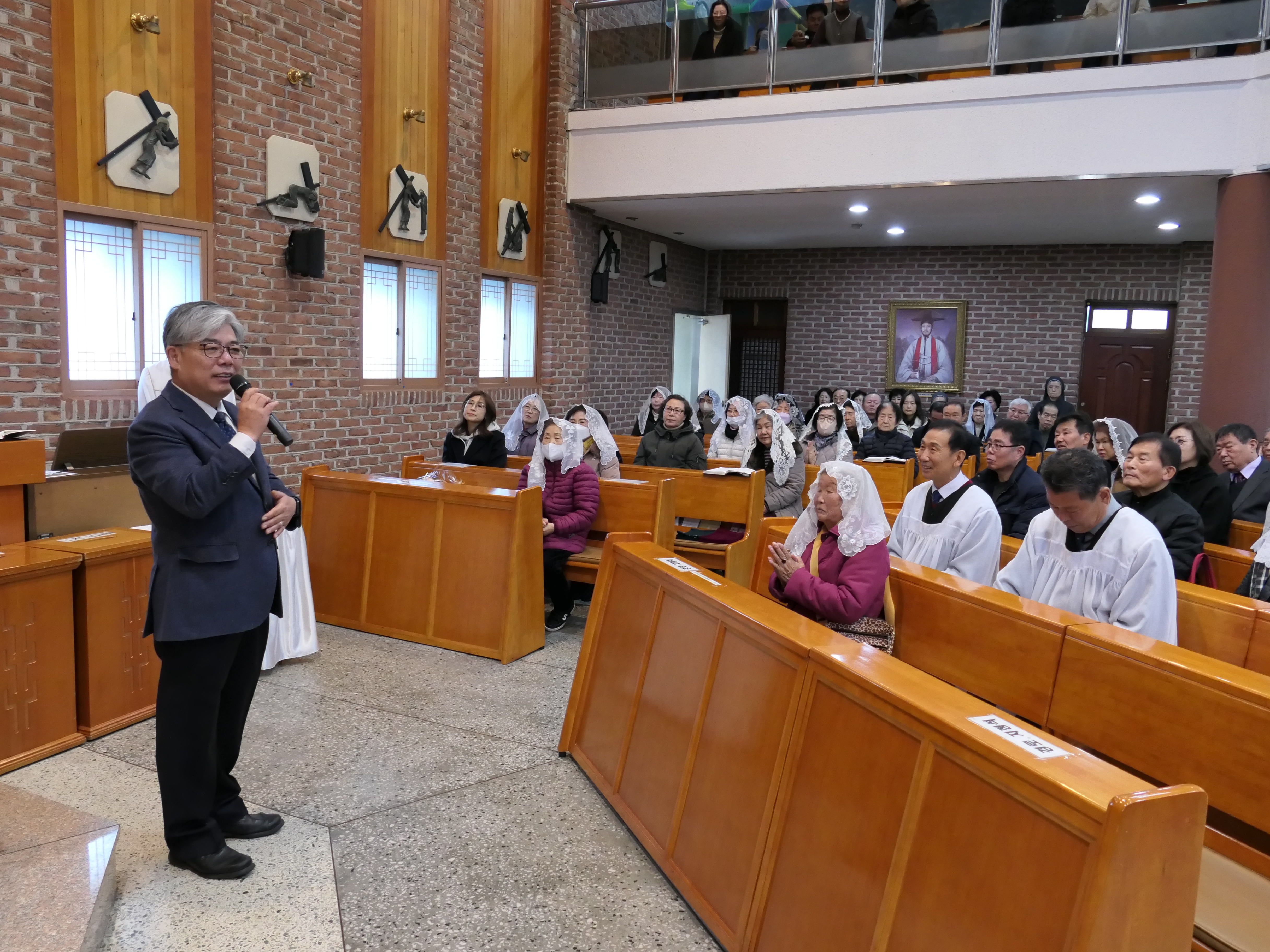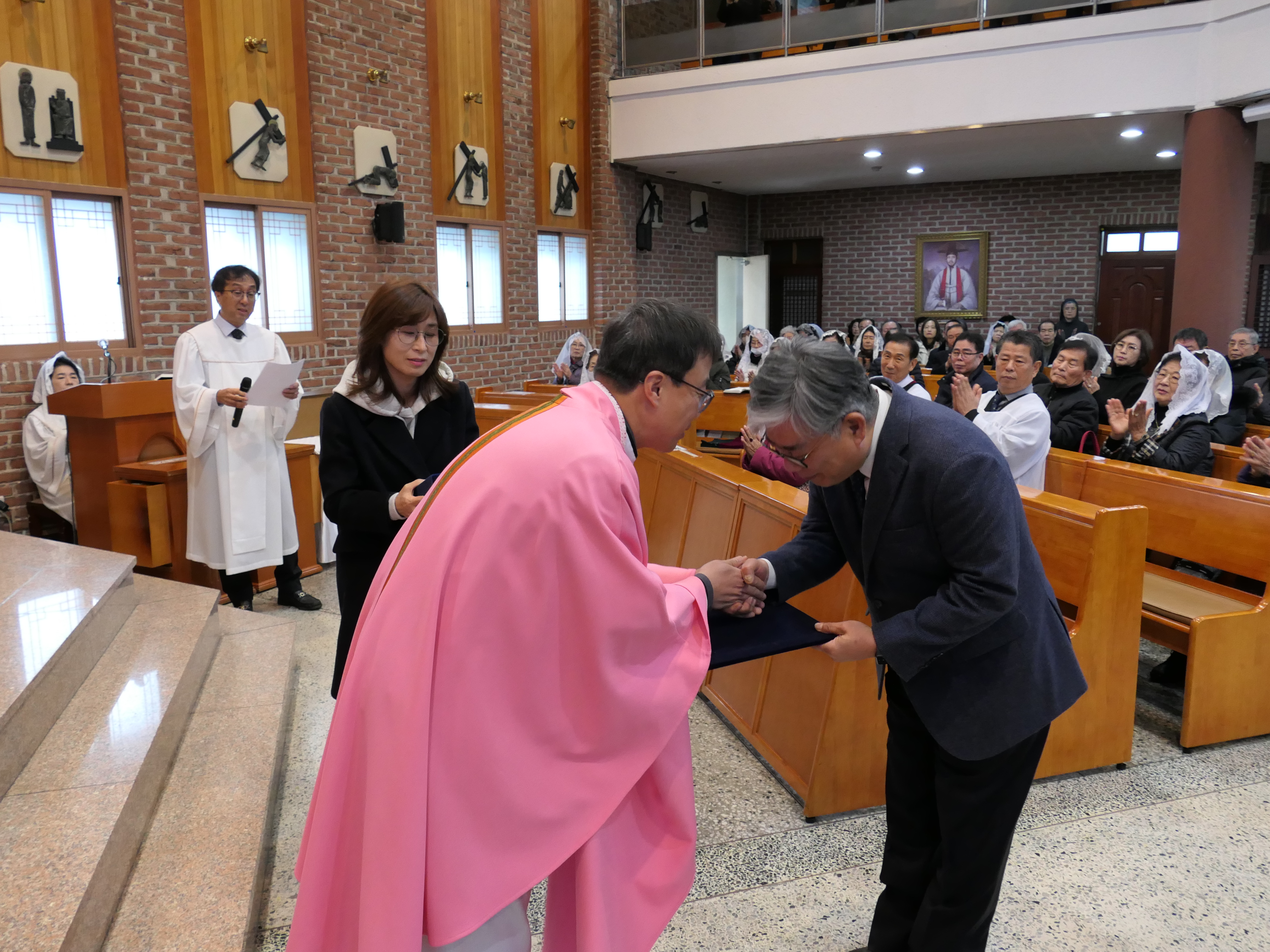 교중미사 도중에 지난 만 4년간 본당 사목협의회(25대,26대)를 이끌어준 최익식(다니엘) 사목총회장에게 신부님께서 감사장과 감사패를 전달하고 있습니다. 전달식이 모두 끝난 뒤에 이임하는 사목총회장이 신자에게 소회를 말하고 있습니다. 그동안의 봉사에 감사합니다!