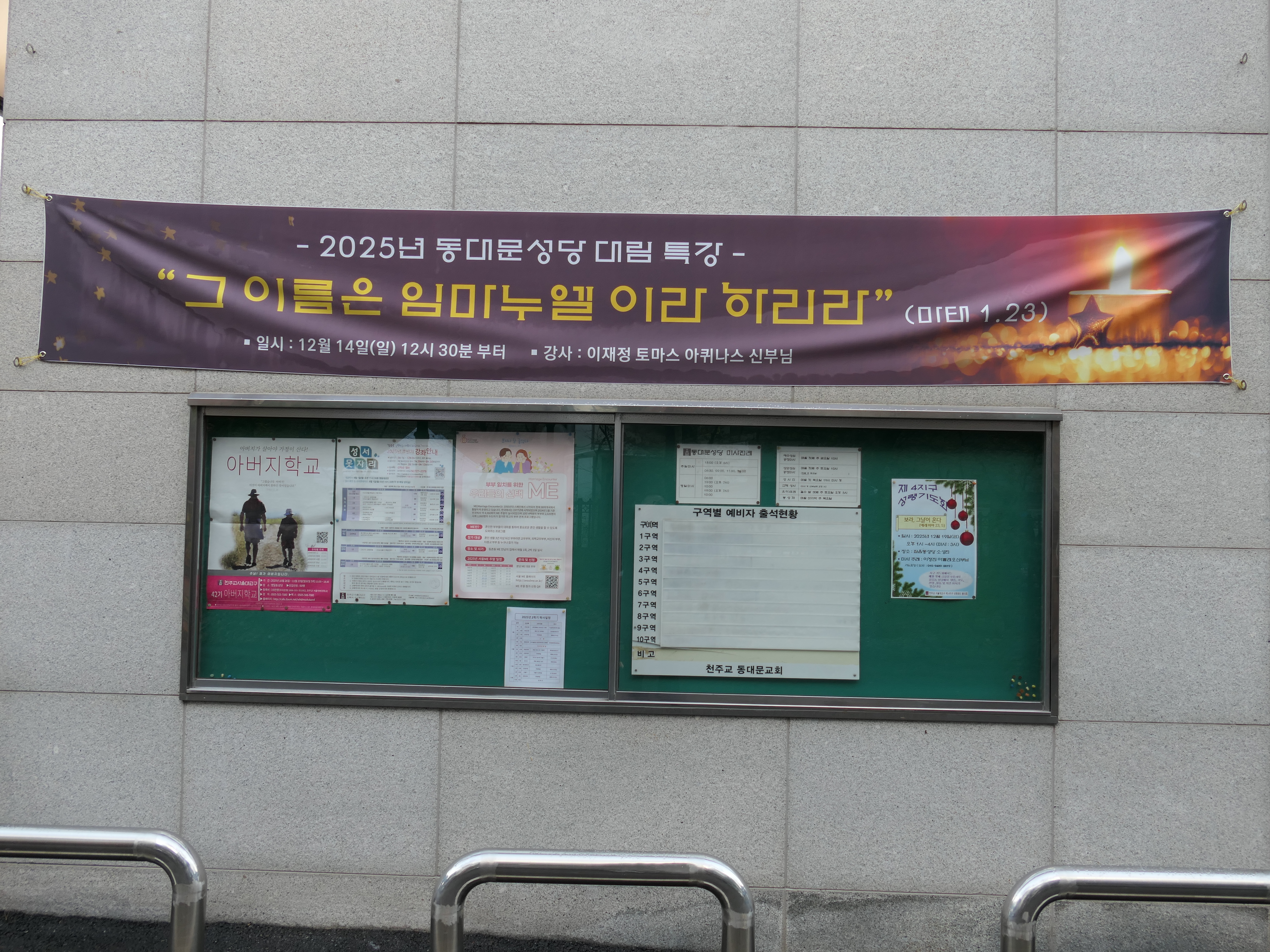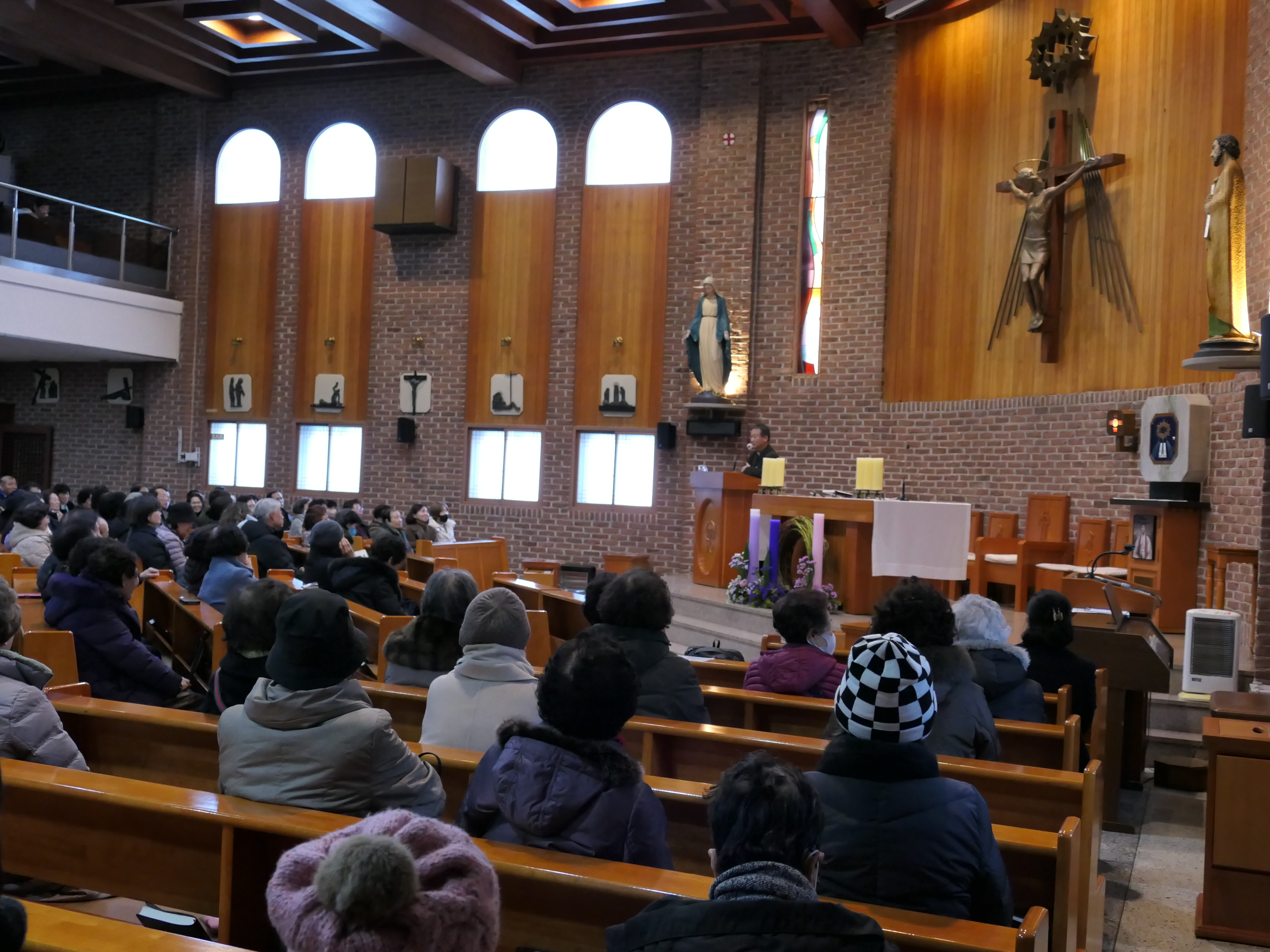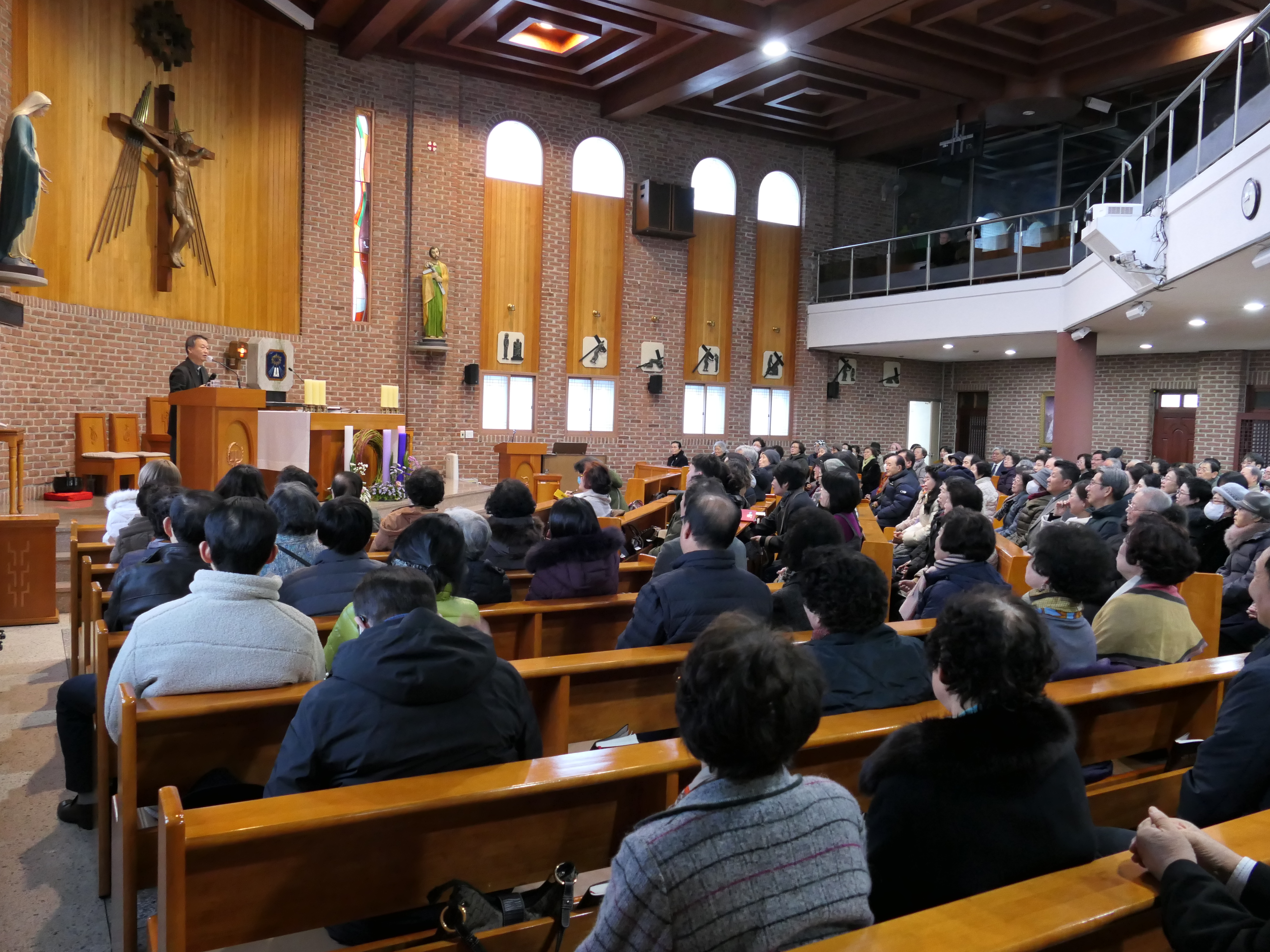 교중미사를 마치고 오후 12시 30분부터 약 1시간 30분 동안 이재정(토마스 아퀴나스) 신부님의 대림 특강 시간을 가졌습니다. 신부님은 현재 경기도 고양시 일산동구(의정부교구)에 있는 국립암센터 원목실장으로 사목하고 계십니다. 신부님은 "우리는 죽을 때까지 많이 부족한 상태로 여전히 미완성 과정 중이며, 서로의 부족함을 채워주는 삶을 살자"고 말씀하시고, "공동체가 함께 바치는 기도인 미사가 세상에서 최고의 가치임을 잊지 말자"를 강조하셨습니다. 또한 "물질적인 것에 대한 집착보다는 갓난아기를 이 세상에 보내신 하느님의 뜻과 '임마누엘'이란 의미를 다시 한번 깊이 묵상하는 대림시기을 보내자"라고도 말씀하셨습니다.