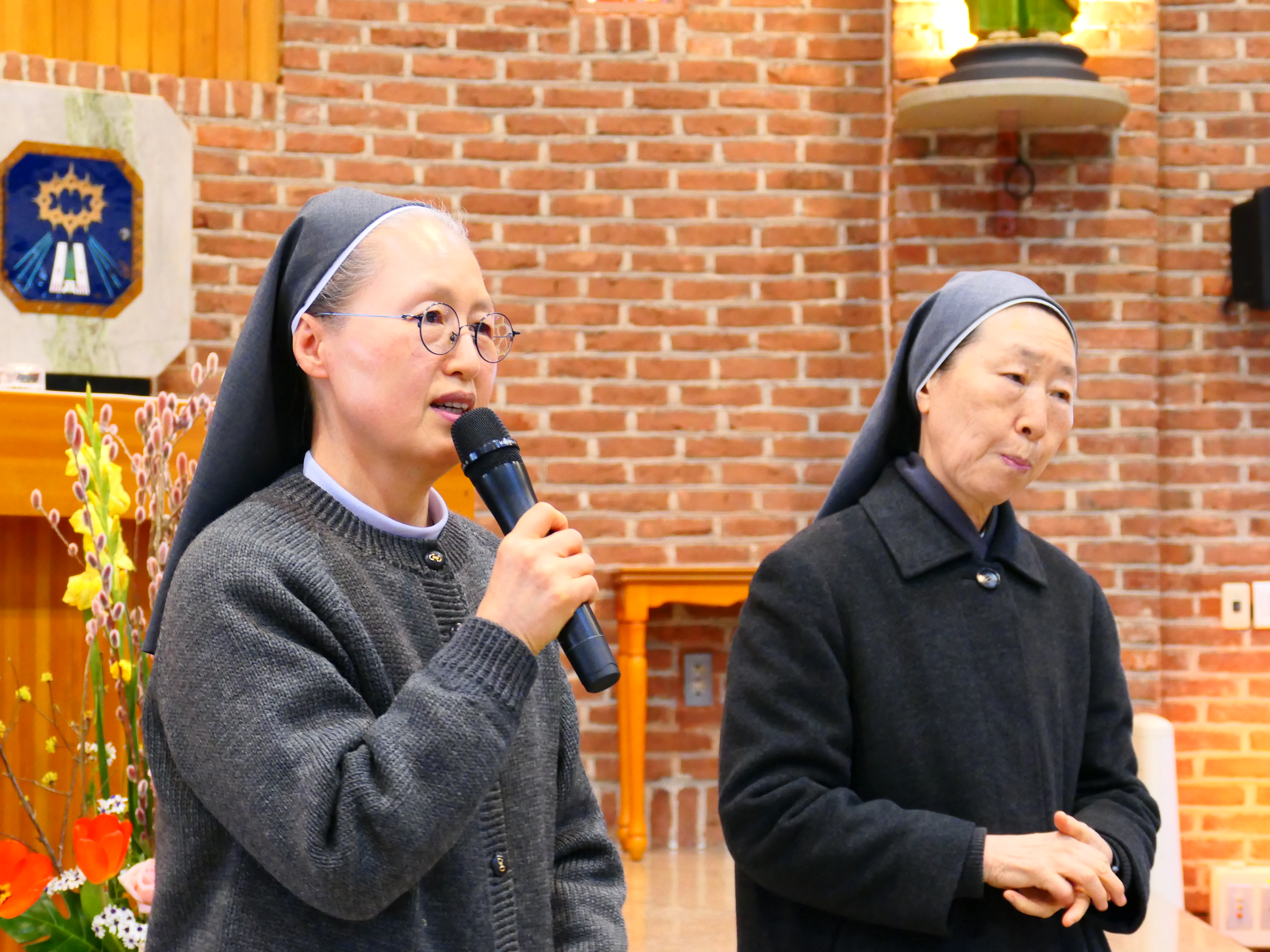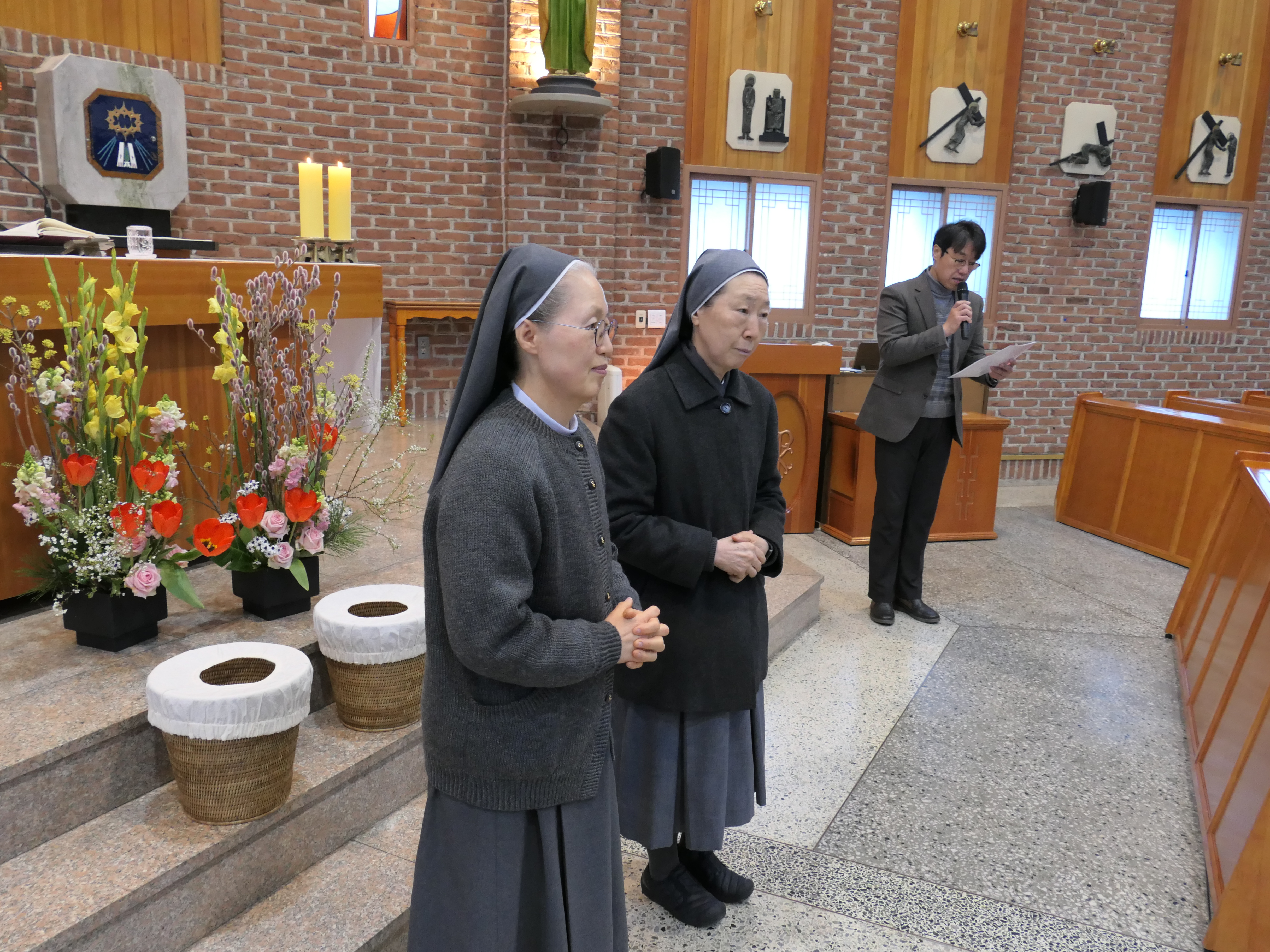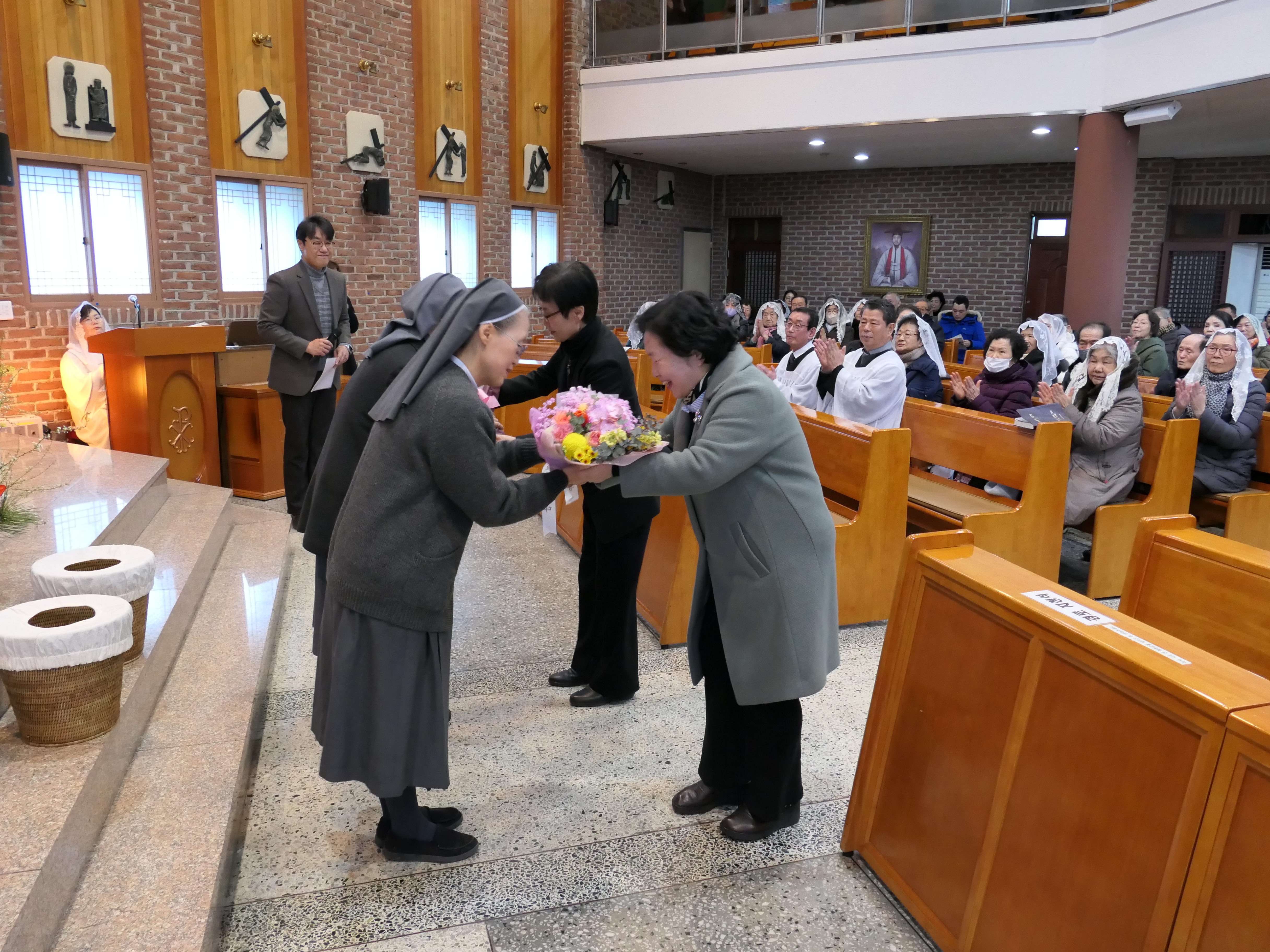 지난 2월 3일에 본당으로 새로 오신 두 분 수녀님을 위한 환영식이 교중미사 시간에 열렸습니다. 이성권(아녜스) 여성총구역장과 손무옥(유스티나) 전례분과장이 꽃다발을 전달하고 있습니다. 이미경(마르타, 사진 왼쪽) 원장수녀님은 경기도 시흥시에 있는 신천성당(인천교구)에서, 안영애(마리 데레사, 사진 오른쪽) 전교수녀님은 가까운 곳에 있는 서울시 중구 신당동성당에서 소임지를 이동했습니다. 두 분 수녀님이 우리 본당에 빨리 적응하고 친해질 수 있도록 많은 도움과 기도를 부탁드립니다. 우리 본당에 오신 것을 진심으로 환영합니다!!!